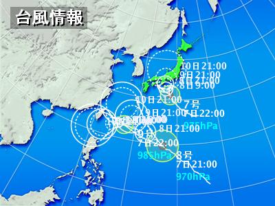 いやただなんとなく........ 家に帰ってきて何気にヤフートップページのニュースのトピックの欄に目を通すと なんと台風7号上陸?! へー台風上陸するんだ~ 涼しくなればいいね~ なんて 軽い気持ちでニュースのページを開いたところ........... なにこれ?! 詳しく見てみるとなんか3個いっぺんに台風が来ているみたいです。 自分はテレビは全く見ないので、気象情報、特に台風情報にホント疎いです☆ 去年もなんか風邪強いな~ なんて思いながら出勤して会社で台風が来ることを知ったりとか........ 会社でみんなに苦笑されましたが それでもテレビは見ない!! そうそう、もしなんかテレビで避難勧告とかあったら誰でもいいのでメールくださいね(笑) 一応助かりたいので☆ PR